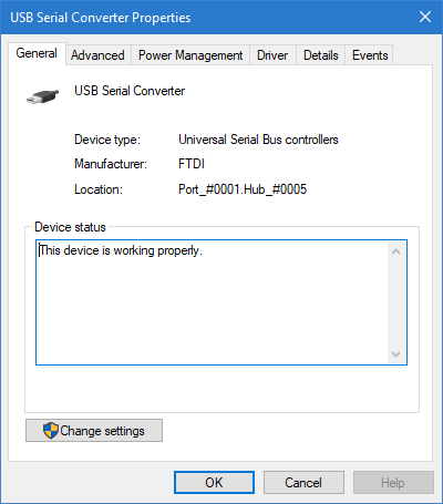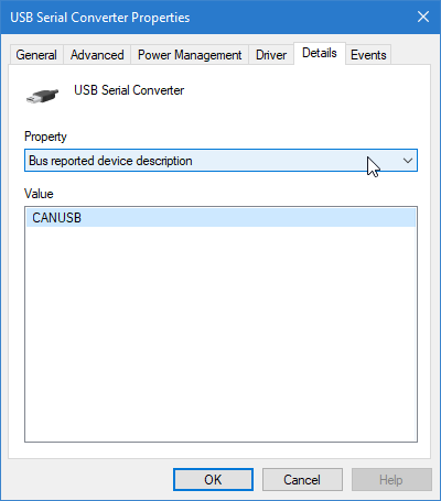 The unit is listed as every other FTDI-based serial adapter. If there are additional devices with identical list entry, we need to find out if this entry is the correct instance. Click on „Details“ tab and select „Bus reported device description“. It should show „CANUSB“:
