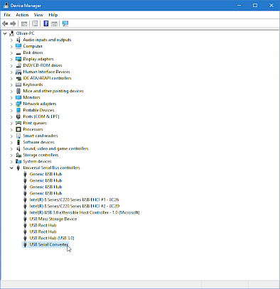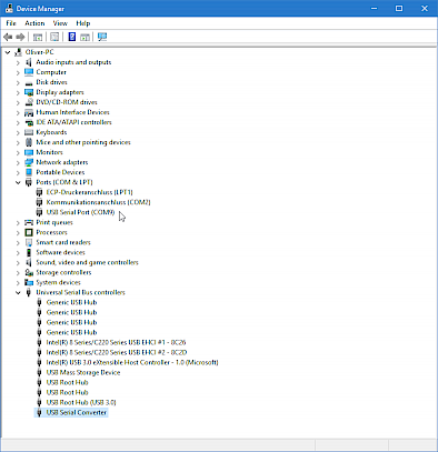 Start Device Manager. If drivers are installed properly, CANUSB will be listed in section „Universal Serial Bus controllers“ as „USB Serial Converter“:
