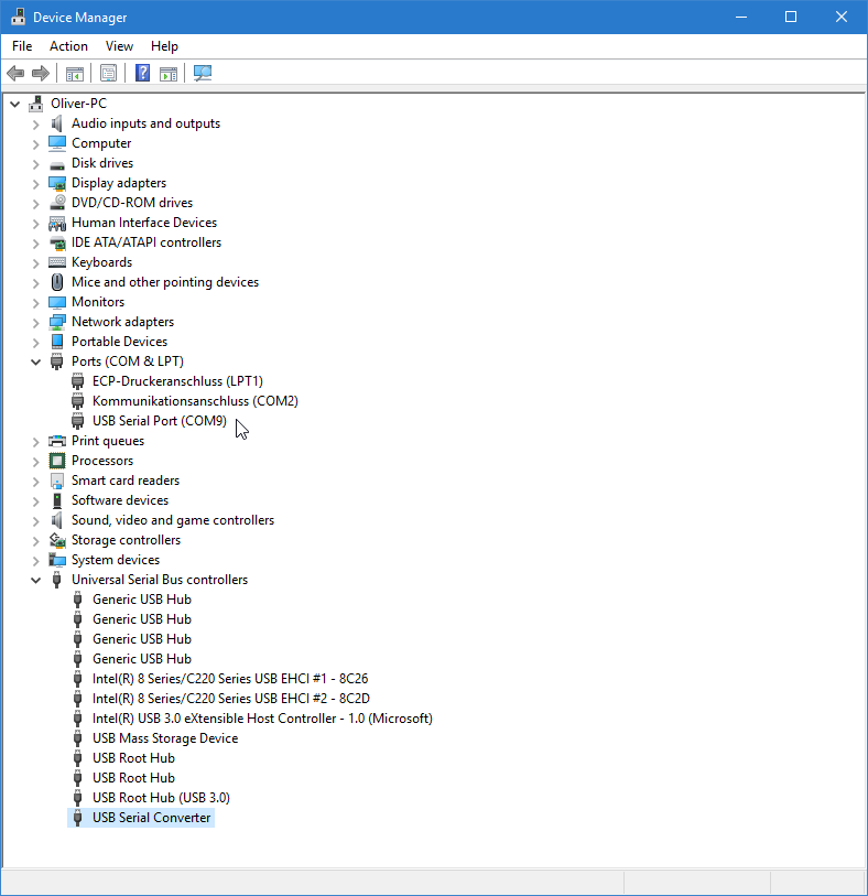 Click OK to leave the dialog and re-plug the CANUSB unit. Once Device Manager window updates, there will be an additional COM port listed in section „Ports (COM & LPT)“. In our example, COM2 existed already (installed on motherboard) and COM9 is the new port which is associated with CANUSB: